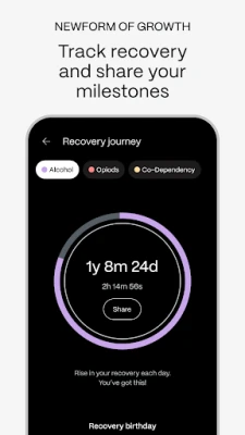 - Use the Recovery Tracker to mark milestones and progress on your journey, celebrating achievements with an uplifting community